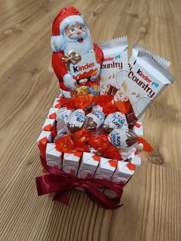 - Kompozisiyalar buket şəklində və ya dairəvi “sepet/qutu” formalarında hazırlanır; kənarı Kinder çubuqları ilə hörgü kimi düzülüb zərif lentlə bağlanır.