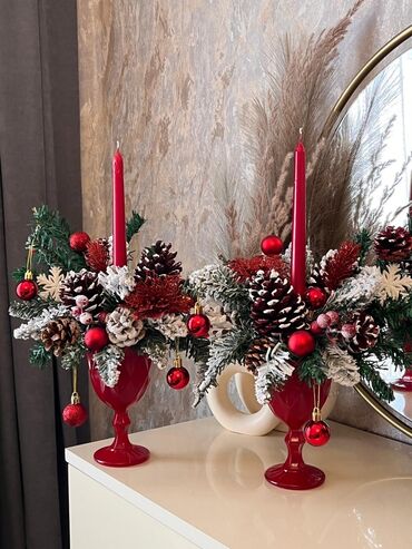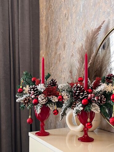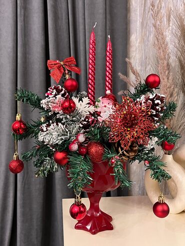 Tərkib: süni iynəyarpaqlar, dekor oyuncaqlar, şam qozaları, dekor giləmeyvələr, parıltılı çiçək, qırmızı şamlar, qırmızı dekorativ ayaqlı qab.