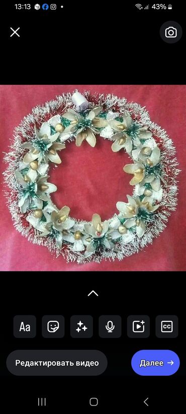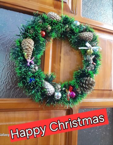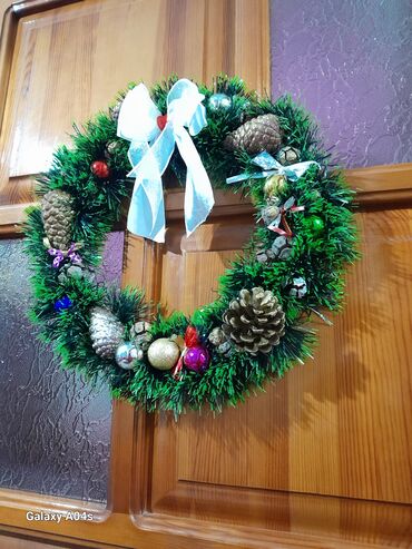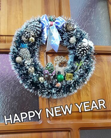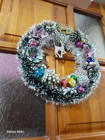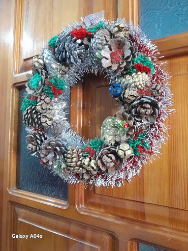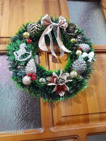 - Material və dizayn: Yaşıl və qar effektli şam budaqlarını xatırladan süni iynəyarpaqlardan dairəvi baza. Üzəri müxtəlif ölçülü şam qozaları, parıltılı bəzək topları, mini hədiyyə qutuları, giləmeyvə dekorları, kiçik fiqurlar (maral, yelləncək at), “Happy New Year”/“Merry Christmas” yazılı dekorlar və parıltılı lentlərlə zənginləşdirilib.