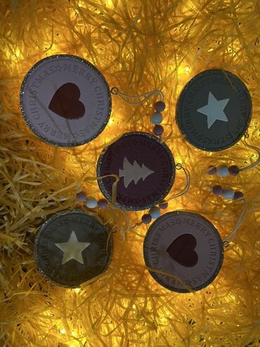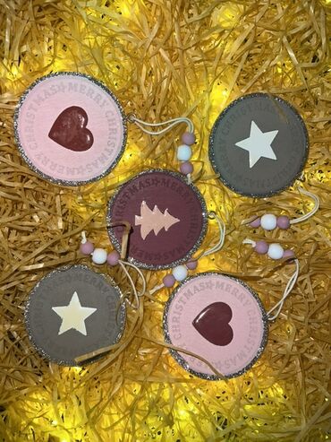 Bənövşəyi-çəhrayı rəng palitrasında parlaq qlitter naxışlı Yeni il/şam ağacı bəzəkləri dəsti. Qutuda 10 ədəd iri ölçülü asma oyuncaqlar var; hər biri ürəkvari/yarpaqvari forma, qabarıq qlitter orna...