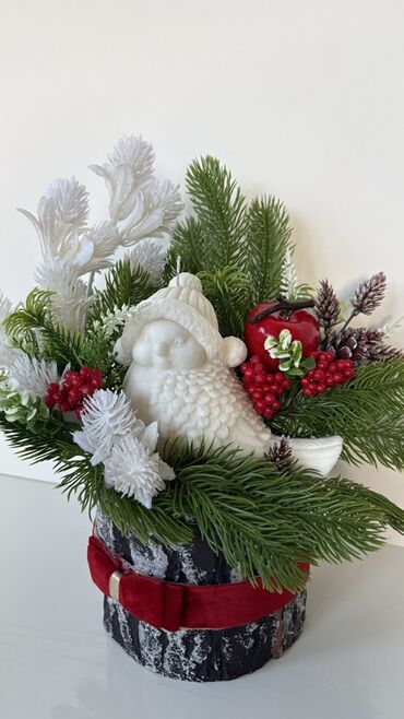 - Yuxarı hissədə həmişəyaşıl şam budaqları, ağ “şaxta” effektli süs bitkiləri, qırmızı giləmeyvə dəstələri və dekorativ qırmızı alma