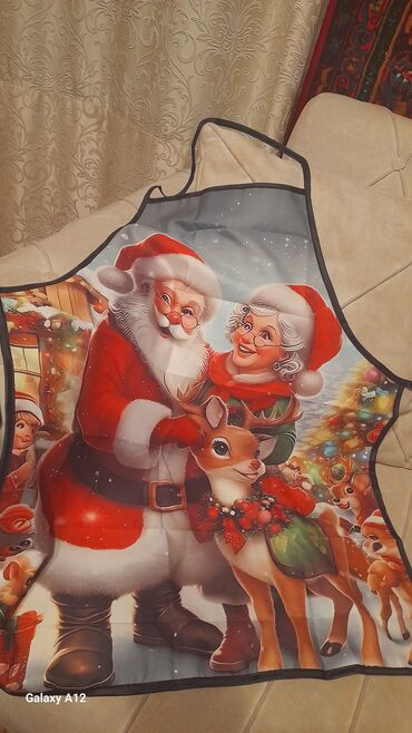 - Önlük: Boyundan asılan və beldən bağlanan klassik forma; parlaq şaquli çapla, Şaxta baba və qarı təsvirli; mətbəxdə bişirərkən geyinmək üçün