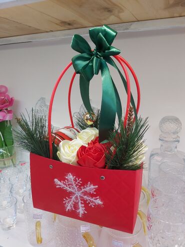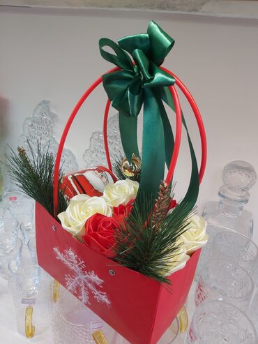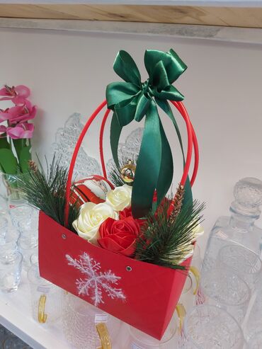 - Daxilində süni şam budaqları, qızılı bəzək zəngi, Yeni il oyuncağı (şən obrazlı top) və atlas parça güllər (ağ krem və qırmızı rənglər).