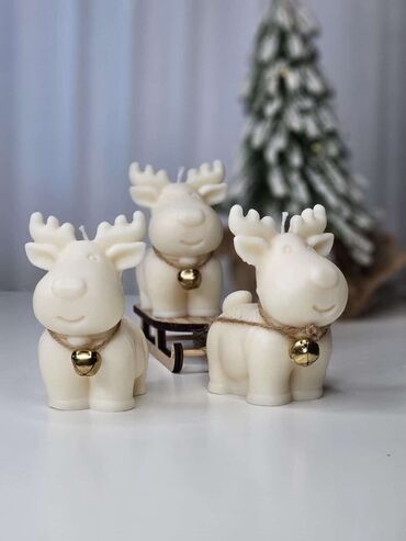 Bayram temalı dekorativ şam dəsti - Forma: ağ maral və ağ yolka fiqurlu şamlar - Material: təbii soya mumu - Rəng: tam ağ - Dizayn detalları: - Hər iki şamda qırmızı-ağ bükülü ip - Maral fiq...