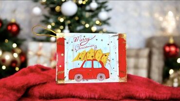 2) “Merry Christmas” yazılı, üstündə hədiyyələr olan qırmızı maşın illüstrasiyalı