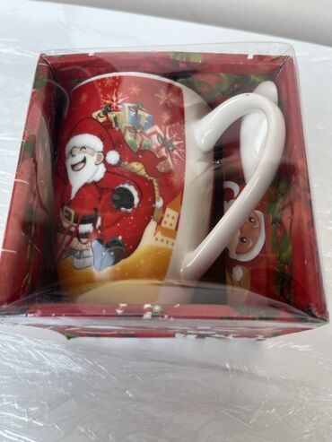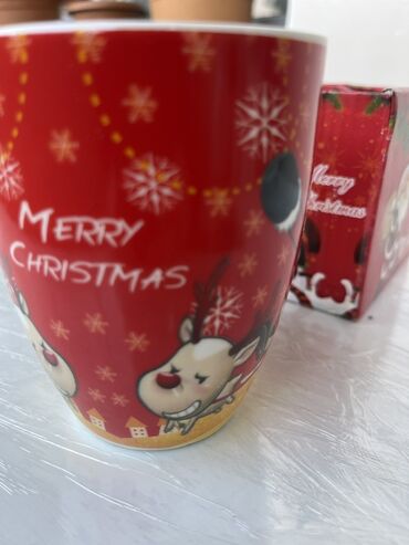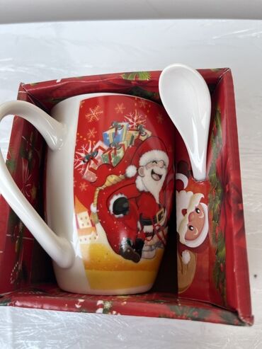 Yeni il temalı fincan dəsti - Hədiyyə qutusunda dekorativ fincan + kiçik qaşıq komplekti - Qırmızı bayram dizaynı: Santa Klaus, qar adamı, şam ağacı və “Merry Christmas” yazılı müxtəlif illüstrasi...