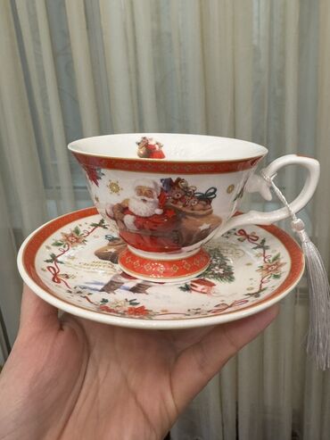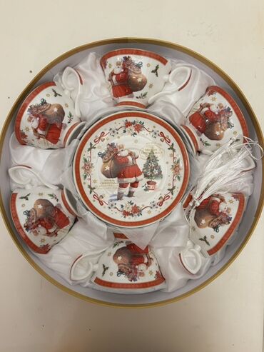 - Fincanların iç tərəfində kiçik Şaxta Baba təsviri, kənarlarında dekorativ haşiyə