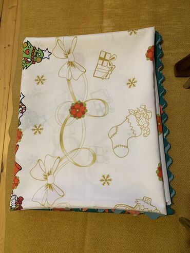 Məhsul: Yeni il temalı süfrə/parça Təsvir: - Rəng: Ağ fon üzərində qızılı naxışlar və kənarlarda rəngarəng Yeni il elementləri - Dizayn: Qızılı lent və qırmızı bəzəkli çələng motivləri, hədiyyə qu...Giriş•Qeydiyyat