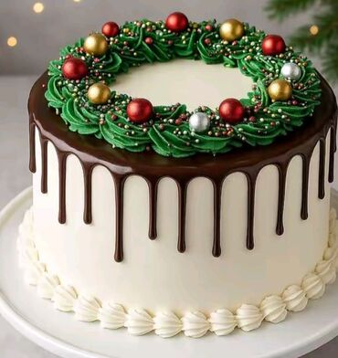 - Rəng və üslub çeşidi: parlaq mavi və qırmızı krem örtüyü, klassik ağ fonda şokolad “drip” effekti, yaşıl krem bəzəkləri.
