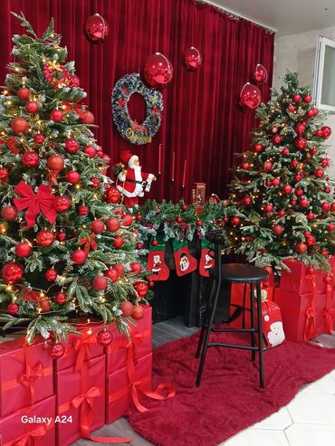 - Qırmızı temalı klassik Yeni il guşəsi (iki ağac, qırmızı bəzəklər, balonlar, hədiyyə qutuları).