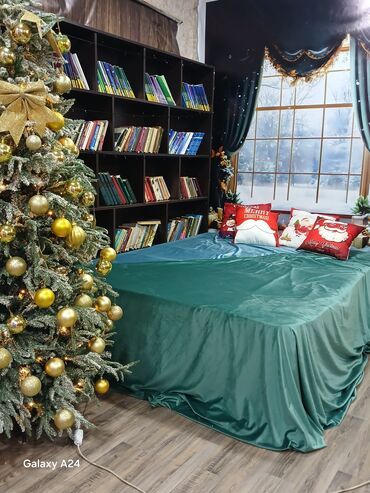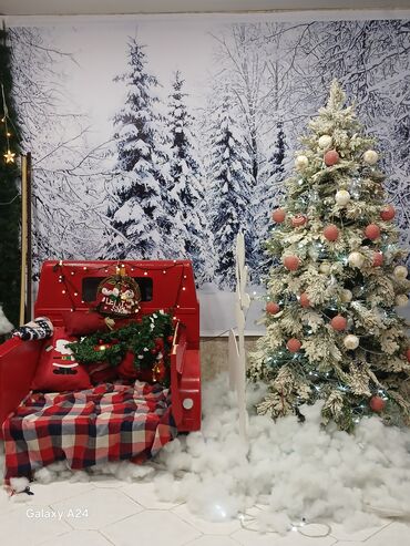 - Fotozona elementləri: fon pərdələri və işıqlı pərdələr, süni ocaq-mantal, qırmızı oturacaq və bar taburesi, “qar” effekti üçün pambıq buludlar.