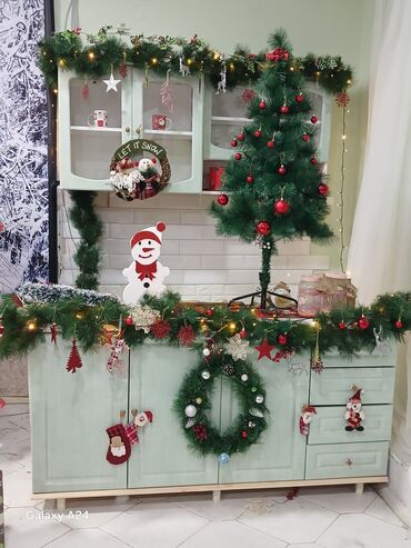 - Kranslar və kompozisiyalar: “Merry/Christmas” yazılı kranslar, şam budaqlarından süfrə kompozisiyaları, şamdanlar.