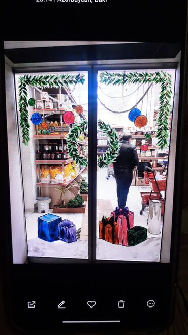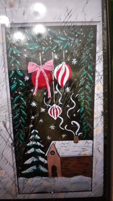 Məhsul/xidmət: Yeni il mövzusunda pəncərə rəsmləri - Dizaynlar: Şam çələngi, saçaqlı böyük qırmızı lent, bəzəkli konfet-çubuqları, poinsettia gülləri, qar dənələri; giriş qapıları üçün asma çələng...