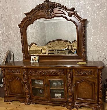 Klassik üslubda qonaq otağı mebel dəsti Tərkibi: - Geniş bufet-konsol və iri dekorativ güzgü - 4 qapılı vitrin (şüşə qapılar, şüşə rəflər) - Tək qapılı vitrin (şüşə qapı, şüşə rəflər) - TV üçün ko...