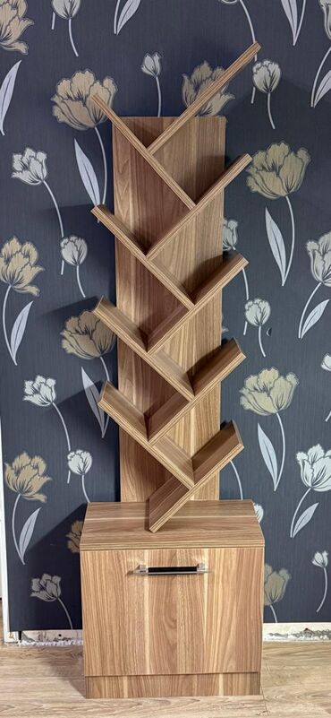 Divar rəfi – müasir dizayn - Material: ağac teksturalı laminat/LDSP - Rəng: təbii ağac tonu, açıq kənar bordürlə - Konfiqurasiya: pilləli kompozisiya; 6 açıq bölmə (dörd üfüqi, iki şaquli) - İstif...