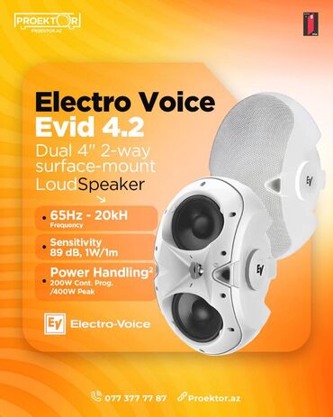Electro Voice Evid 4.2 Electro Voice Evid 4.2 ağ rəng Dual 4" 2-way surface-mount LoudSpeaker *65Hz - 20kH Frequency *Sensitivity 89 dB, 1W/1m *Power Handling2 200W Cont. Prog. /400W Peak