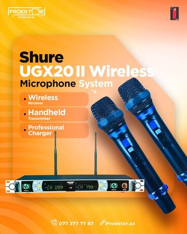 Mikrofon "Shure UGX20 II" Wireless Shure mikrofonlar. cox kefiyyətlidir. metal korpus, dəyisdirilə bilən baslıq, led ekran zəmanət verilir. say var