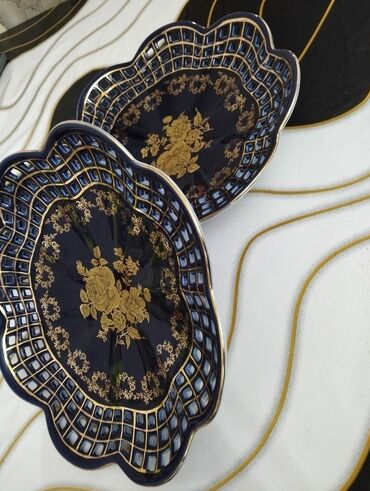 2ədəd-25azn.Çox keyfiyyətli şirniyyat qabı dəsti,qırağları və ayağ hissəsi qızıl suyuyla işləməli.Dəst təzədir heç istifadə olunmayıb. Tək halda da satılır 1ədəd -15 azn.