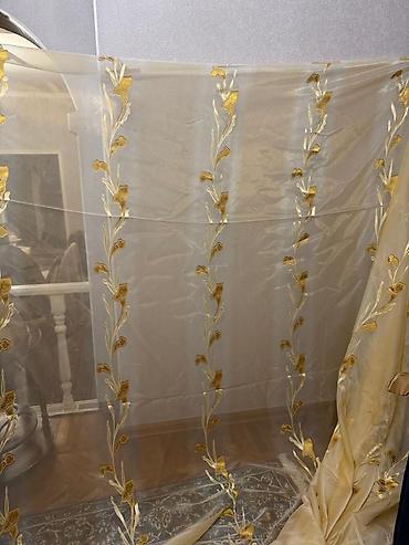 Pərdə. Tül. Eni-3 m, uzunu -2 m70 sm+ 10 sm saçagı. Rəngi- agdır ,amma şəkildə elə düşməyib,4 ədəddir, heç bir defekti yoxdur