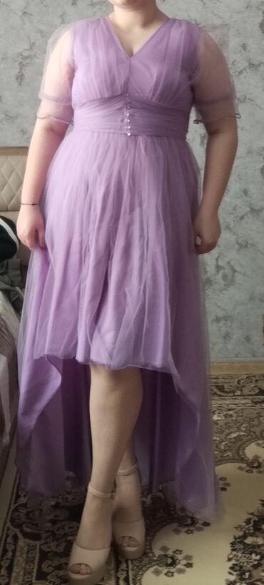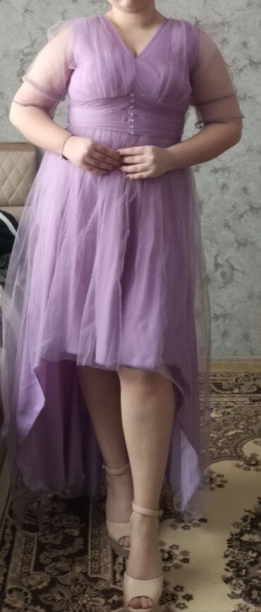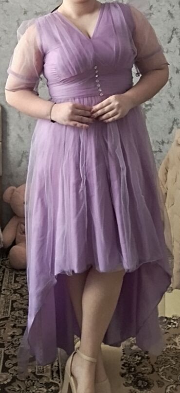 Zərif ziyafət/libas - Rəng: toz-çəhrayı (lilac tonlarında) - Model: uzun, A-kəsimli, yüngül flarlı ətək - Parça: şəffaf tül üst qat, incə romb naxışlı; altlıqla birlikdə - Yaxa: V-kəsim - Qol: 3/4...