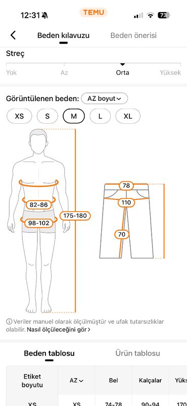 Təzədir, M ölçüdür. hədiyyə verilib ölçü uyğun deyil. parça materialı pambıqdır qofre naxışlıdı. sport , sport-klassik stildədi. öz qiyməti 52 AZN-dir, 26-ya satıram
