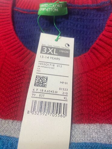 BenettonYeni.Hediyye qutusunda .13-14 yaşlı Oglan üçün sviter Benneton 3xl (170 boy) .Hədiyyə üçün 70 azn alınıb,lakin razmer uygun olmayıb.Öz qiymətindən aşagı satılır.