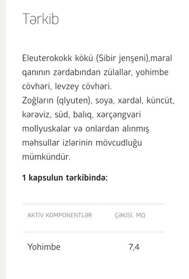 Eleuterokokk kökü (Sibir jenşeni),maral qanının zərdabından zülallar, yohimbe cövhəri, levzey cövhəri.