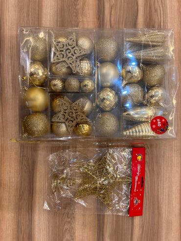 Yeni il aksesuarları. Şəkillərin ardıcılığı ilə qiymətlər və məhsul təsviri: 1) Yeni il aksesuarı. 10 manat. 2) Yolka oyuncaqları. 6 ədəd. Hamısı 8 manat. 3) Yolka oyuncaqları. Böyük şarlar böyü...