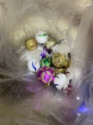 - Bəzəklər: müxtəlif ölçülü şüşə/ plastik dekor toplar (qızılı, çəhrayı, ağ və s.), mirvarə tipli muncuq zəncirlər, şam ağacının ətrafı üçün bir neçə rəngdə (gümüşü, mavi, qızılı, bənövşəyi) parıltılı tinsel/qarışqa qırçıqları.