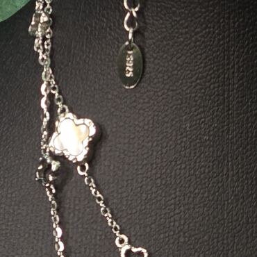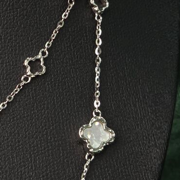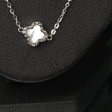 Gümüşü 925 tebii sədəf daşi , yonca formalı elementlərlə bəzədilmiş qolbag ve boyunbağ dest . Zəncirin uzunluğu tənzimlənə bilər. Zərif və dəbli aksessuar kimi müxtəlif üslublarla uyğunlaşdırıla bilər.