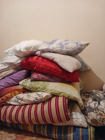 - Fərqli ölçülərdə balışlar: ağ, mavi, qırmızı və naxışlı üzlüklərlə