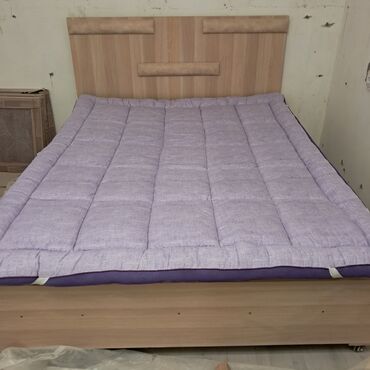 - Komplektdə görünən bənövşəyi rəngli qalın toppper/yorğan üstlük (dördkünc tikişli, kənarları tünd bənövşəyi haşiyəli, elastik bantlı)