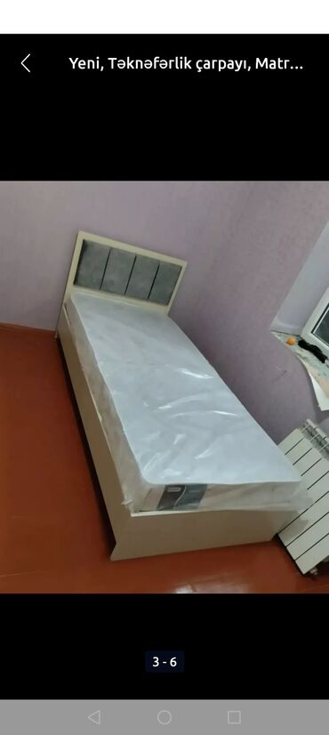 Təknəfəlik çarpayı – başlıq hissəsi yumşaq parça ilə kapitonajlı, 3 bölməli dekor. Korpus açıq krem/ağ tonlarda, düz xətli modern dizayn. Komplektdə uyğun ölçülü ortopedik döşək göstərilir. Çarpayının yan və ayaq hissələri möhkəm taxtadan/LDSP materialdan yığılma, stabil konstruksiya. Minimalist interyerlərə uyğundur, həm uşaq, həm də qonaq otağı üçün praktik seçim. Rəng variantı kimi boz və mavi başlıqlı modellər mövcuddur. Səliqəli və rahat yuxu üçün ideal, yığcam ölçüsü sayəsində kiçik otaqlara da rahat yerləşir.