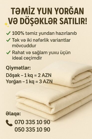 Ailəvi100% təmiz yundan hazırlanmış bu yorğan və döşəklər tək və ya iki nəfərlik variantlarda mövcuddur. Rahat və sağlam yuxu üçün ideal seçimdir. Yorğan və döşək qiymətləri çəkiyə görə dəyişir.