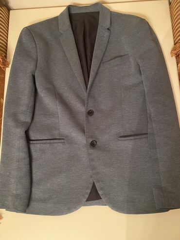 Kişi üçün klassik pencək 48razimer - Rəng: tünd mavi/boz tonlarında - Naxış: incə xətli/çəkmə effektli - Model: iki düyməli, tək sətirli (single-breasted) - Yaxa: klassik kəsim (notch lapel) - Cib...