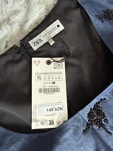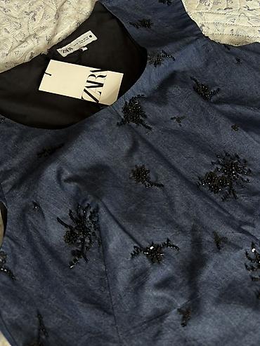 Məhsul: ZARA qadın paltarı - Rəng: mavi/teal tonlarında - Model: ön hissədə kəsişən (wrap-style) V-yaxa, beldən yığma - Uzunluq: midi-uzun - Qol: 3/4 uzunluqda, geniş uclu - Material görünüşü: ipə...