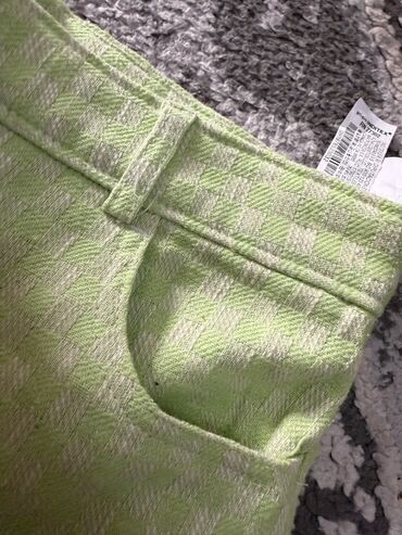 - Rəng: açıq yaşıl - Naqış: kvadratvari toxuma (şahmat tipli faktura) - Kəsim: düz paça - Ölçü etiketi: EU M / USA M / MEX 28 - İstehsal: Morocco - Parça: toxunma, elastik hissiyatlı (etiketdə qarışıq liflər) - Detallar: bel üçün kəmərkeçələr, ön ciblər, fermuar və düymə bağlanma - Dizayn: gündəlik və ya smart-casual kombinlər üçün yüngül, bahar-yay tonlarında diqqətçəkən görünüş