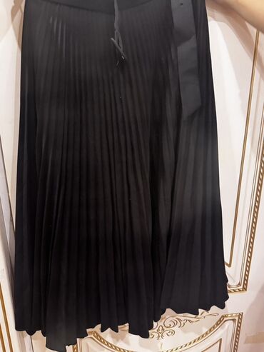 Qara pliseli ətək - Model: midi uzunluqda, geniş pliseli - Rəng: qara, parıltılı səth (atlas/saçaqlı toxuma effekti) - Bel hissəsi: elastik rezinli kəmər, rahat oturuş - Kəsim: A-kəsim, axıcı düşü...