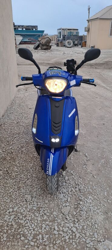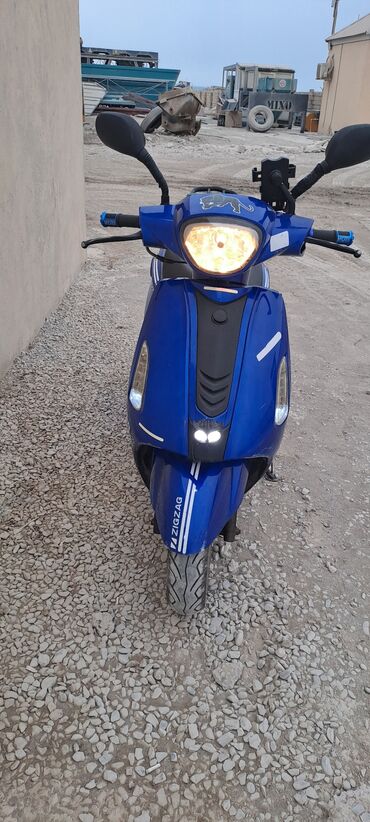 Moped/scooter – ZIGZAG, mavi rəng. Xüsusiyyətlər: - Şəhər içi rahat hərəkət üçün yığcam kuzov və aşağı oturacaq hündürlüyü - Ön disk əyləci, arxa baraban əyləci - İki arxa amortizator - Elektrik s...