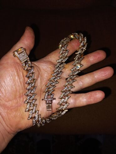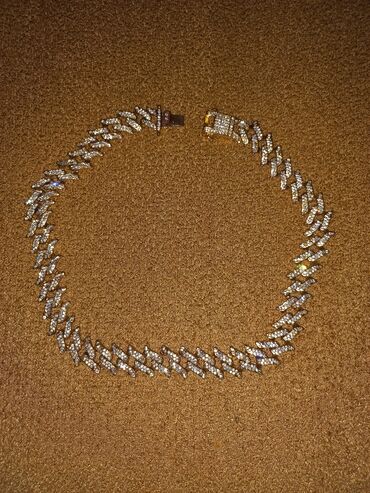 - Dizayn: “Cuban link” tipli enli zəncir, hər bəndi xırda parlaq daşlarla (zirconiya/rinestone tipli) tam örtülüb.