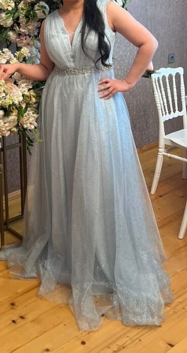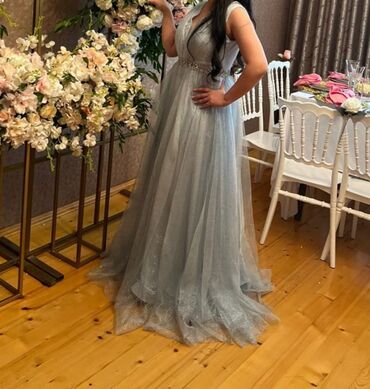 Uzun mavi rəngli ziyafət geyimi. 38,36 razmerdir. 200 m tikilib. Cəmi 3 saatliq geyilib.