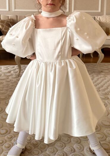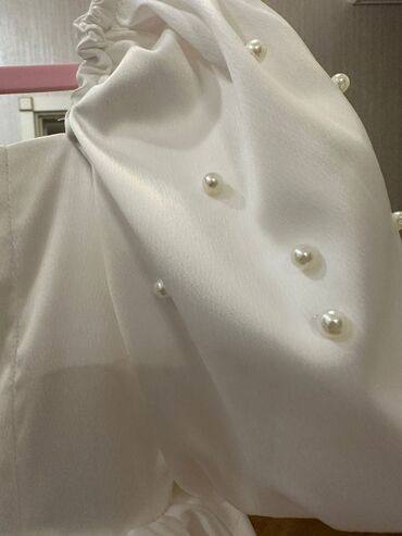 Ağ rəngli zərif ziyafət/libas paltarı - Model: qolsuz deyil, həcmli şifon “puf” qollar (inci detallarla) - Yaxa: dairəvi, klassik - Siluet: düz/kastom kəsim, bel xəttini vurğulayan - Beldə aksesua...