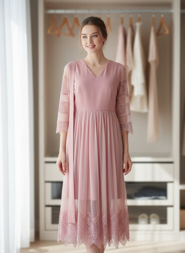 Cemi 1defe toya geyinilib .Mauve/çəhrayı-bənövşəyi tonlarda zərif axıcı ziyafət/libas. - Parça: yüngül şifon qatlar, alt hissədə bol və dalğalı görünüş. - Üst hissə: V-formalı dekolte, qatlamal...
