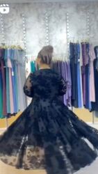 Qara don. 46 ölçü - Rəng: saf qara - Kəsim: uzun, bədənə yığılan siluet; yüngülcə ətəyi genişlənən - Parça: xırda, incə parıltılı tekstura ilə - Üst detal: çiyinləri və üst hissəni örtən çıxarıla ...