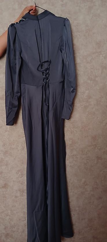 Tünd boz rəngdə, uzun qollu, zərif parçadan olan ziyafət donu. Yuxarı hissəsi büzməli, şifon materialdan hazırlanmışdır və boyun hissəsində büzmə detalı var. Arxa hissəsində isə iplərlə bağlanan, korset stilində olan dizayn mövcuddur. 120yə alınıbdı endirim oluna bilər, 1 dəfə toya geyinilib ölçü 40 42