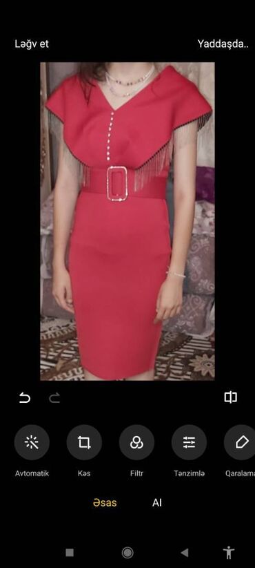 Bir dəfə geyinilib. Qırmızı ziyafət/libas - Stil: Klassik və zərif, bədənə oturan siluet - Uzunluq: Maxi; yan hissədə dizə qədər yarıq - Yaxa: Dairəvi, qol...