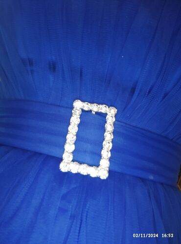 Zərif ziyafət/libas – kral mavisi uzun don. - Parlaq kral mavi rəng - Yumşaq, axıcı parça; ön hissədə dərin V-yaxa - Bel hissəsində iri aplikasyon: mirvari və daş bəzəkləri ilə işıltılı “kəpənək” ...