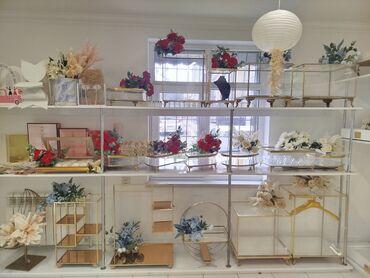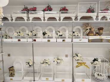 - Gül kompozisiyaları: krem, ağ, qırmızı və mavi tonlarda süni güllər və quru çiçək aranjımanları; tac, buket, kompozit bağlama və girland variantları.