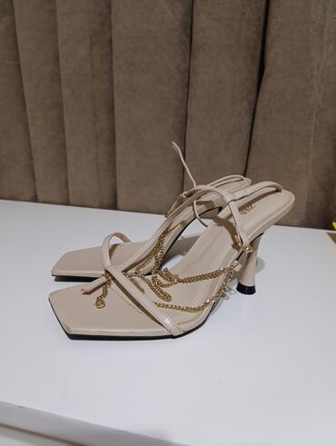 36 razmer..Bej rəngdə, dabanlı və qayışlı qadın səndəlləri. Ayaqqabıların ön hissəsində dekorativ daşlar var. Ziyafət və xüsusi günlər üçün idealdır.