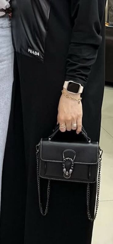 Ünvandan götürməQara rəngli, zəncirbəndli və qısa tutacaqlı dəbli çanta. Kiçik əşyalarınızı daşımaq üçün idealdır. Çantanın ön hissəsində metal bəzək elementi var. Daxilində cibləri var. 2defe taxilib